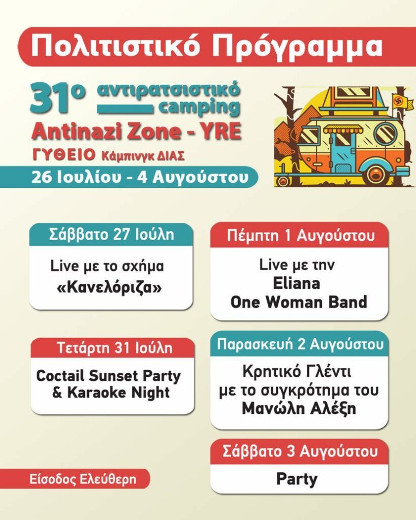Η κεντρική ιδέα του κάμπινγκ είναι να οργανώσουμε συλλογικές διακοπές με περιεχόμενο! Σκοπός μας είναι να γίνει μια διοργάνωση που θα φέρει κοντά ανθρώπους, να κάνουμε φτηνές και εναλλακτικές διακοπές, να ανοίξει το διάλογο μεταξύ μας για το πως θέλουμε να ζούμε και τι κοινωνία θέλουμε. Τα κάμπινγκ μας διαρκούν 10 μέρες στις οποίες κατασκηνώνουμε όλοι μαζί, γίνονται συζητήσεις, προβολές, πάρτυ και γλέντια, εργαστήρια και εκδρομές, υπάρχει παιδότοπος και αυτοδιαχειριζόμενο μπαρ και κουζίνα. Με δύο λόγια, είναι ένα φεστιβάλ με διάφορες δράσεις και δραστηριότητες. Η συμμετοχή φυσικά σε όλα αυτά είναι προαιρετική. Μέσα από τα κάμπινγκ επιδιώκουμε να έρθουμε κοντά προοδευτικοί άνθρωποι, κόσμος των κινημάτων, άτομα του ευρύτερου χώρου της Αριστεράς, αλλά και καθένας που ψάχνεται και ασφυκτιά κάτω από την πίεση του συστήματος. Το κάμπινγκ διοργανώνεται από το AntinaziZone και τη YRE που είναι αντιφασιστικές και αντιρατσιστικές πρωτοβουλίες. Δεν πρόκειται για κερδοσκοπική διοργάνωση, γι’ αυτό προσπαθούμε να συμβάλλουμε όλοι με προσφορά (ο καθένας όπου μπορεί) και με τη δύναμη της συλλογικότητας μπορούμε να έχουμε χαμηλό κόστος και να κάνουμε φτηνές διακοπές. Ελάτε σε αυτό το ταξίδι μαζί μας!